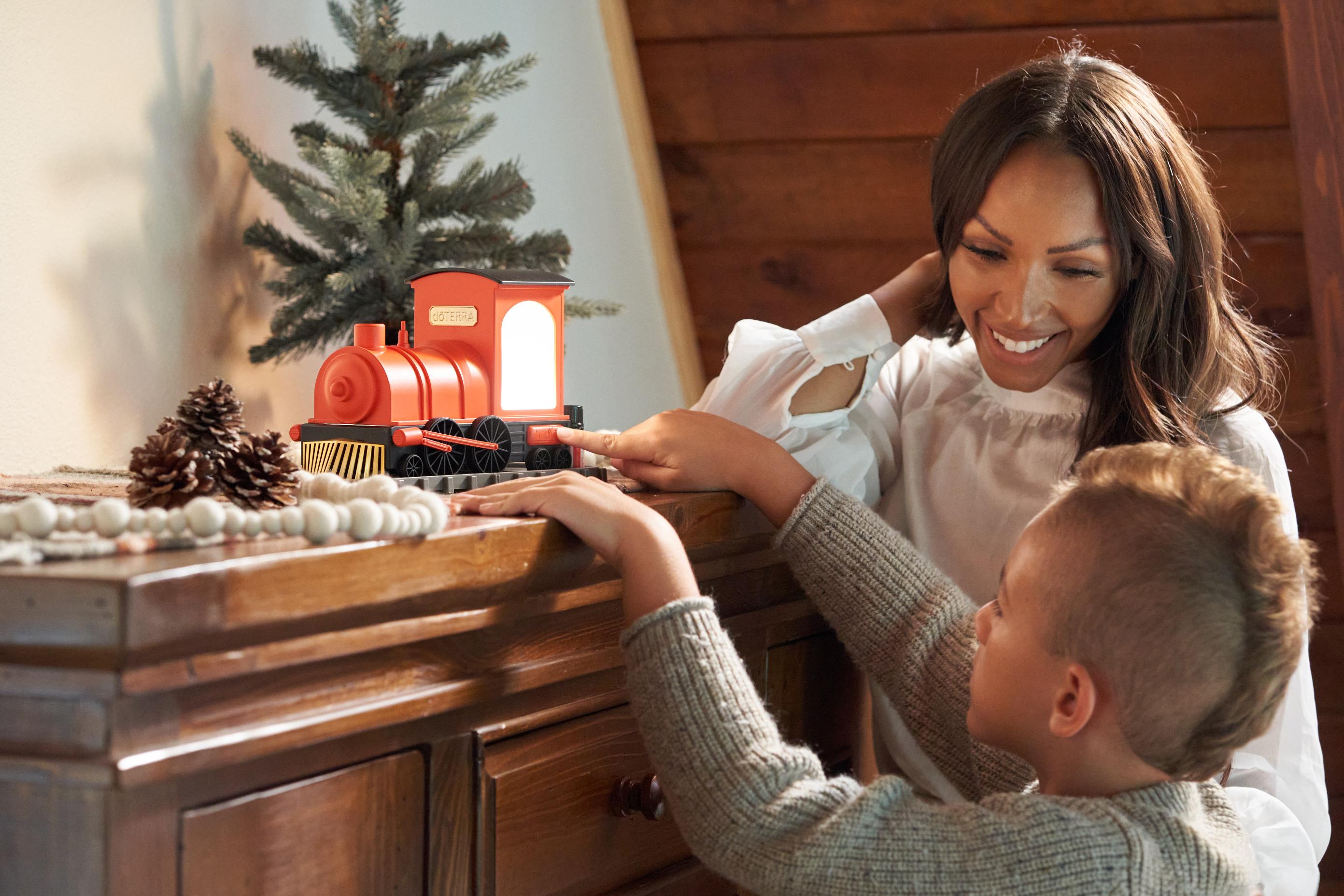 Отправляйтесь в ароматное праздничное путешествие с диффузором dōTERRA Train. Этот очаровательный паровозик словно вышел прямиком из детских воспоминаний! Ярко-оранжевый диффузор с черными и золотистыми элементами выпускает тонкие струйки ароматного пара из трубы. А большие окна кабины с обеих сторон уютно подсвечены. Благодаря этому диффузор станет идеальным ночником для игровой комнаты, спальни или дополнительным элементом праздничного декора. Кроме того, при нажатии на кнопку паровозик может издавать настоящий свисток, который порадует детей любого возраста. Верхняя часть легко снимается для добавления воды и эфирного масла. На подставке в виде железной дороги также помещаются три флакона с эфирным маслом объемом 5 или 15 мл.