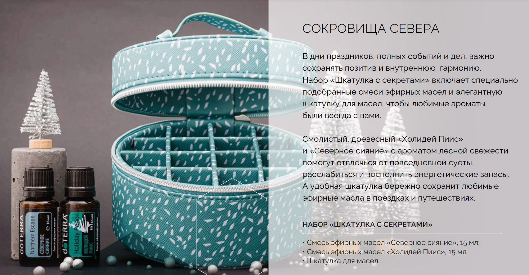 Во время праздников, когда жизнь полна ярких событий и забот, крайне важно сохранить свою жизненную энергию и внутренний покой. Набор 'Шкатулка с секретами' предоставит вам всё необходимое для этого. Смеси эфирных масел 'Холидей Пиис' и 'Северное сияние' позволят отвлечься от суеты и создать атмосферу для отдыха и восстановления сил. 'Северное сияние', благодаря ароматам чёрной ели, сибирской пихты и голландской лаванды, принесёт в ваш дом ощущение свежести и бодрости. А 'Холидей Пиис' с его ярким хвойным ароматом, дополненным нотками грейпфрута, ладана и ветивера, окунет вас в праздничную атмосферу и подарит хорошее настроение всей вашей семье.