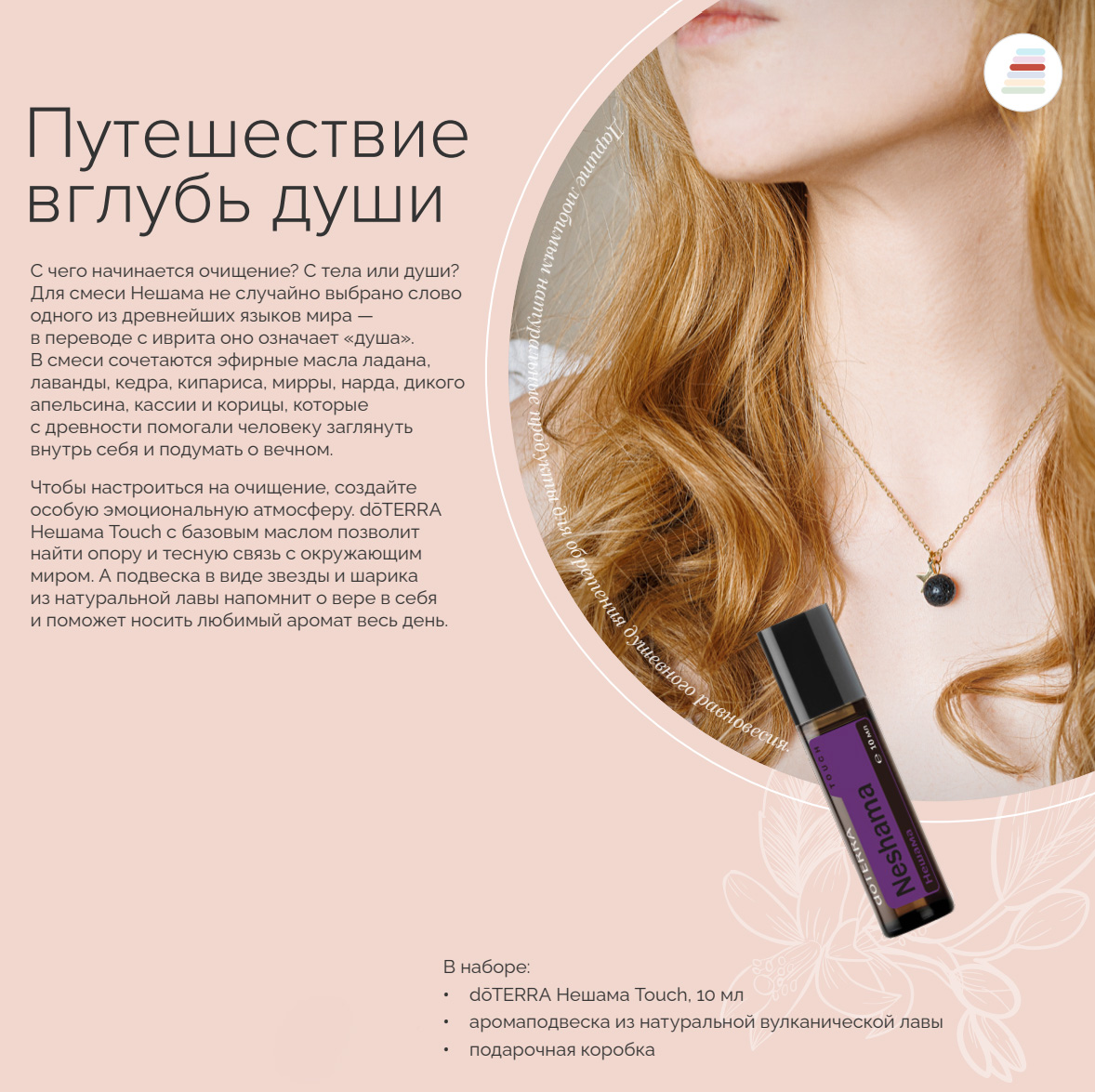 Для обретения душевного равновесия важно быть в гармонии не только с собой, но и со всем миром. А ещё поддерживать это ощущение повсюду, где бы вы ни находились. Эта идея подтолкнула нас к созданию набора «От всей души». Умиротворяющий аромат Нешама Touch будет сопровождать вас весь день благодаря аромаподвеске в виде шарика и звезды. Это не обычное украшение, а вещь со своей природной историей: бусина создана из натуральной застывшей лавы.
