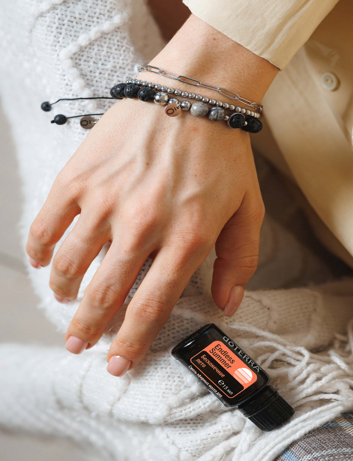 Смесь эфирных масел doTERRA «Бесконечное лето» и стильный комплект браслетов создают яркий, запоминающийся образ. Этот набор — как ароматная открытка из отпуска, полного свободы и радости.