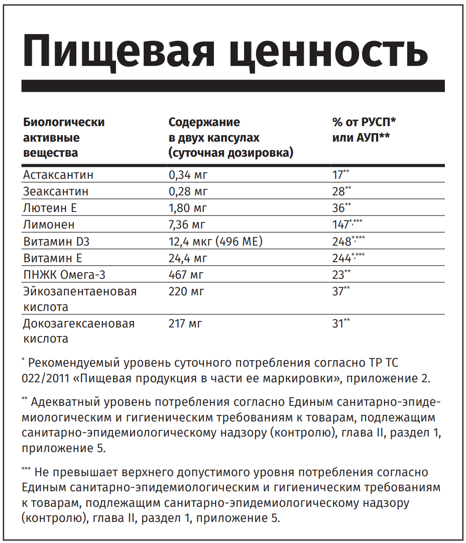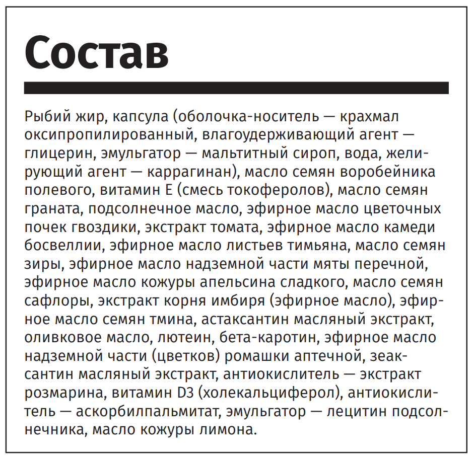Рыбий жир, капсула (оболочка-носитель — крахмал оксипропилированный, влагоудерживающий агент — глицерин, эмульгатор — мальтитный сироп, вода, желирующий агент — каррагинан), масло семян воробейника полевого, витамин E (смесь токоферолов), масло семян граната, подсолнечное масло, эфирное масло цветочных почек гвоздики, экстракт томата, эфирное масло камеди босвеллии, эфирное масло листьев тимьяна, масло семян зиры, эфирное масло надземной части мяты перечной, эфирное масло кожуры апельсина сладкого, масло семян сафлоры, экстракт корня имбиря (эфирное масло), эфирное масло семян тмина, астаксантин масляный экстракт, оливковое масло, лютеин, бета-каротин, эфирное масло надземной части (цветков) ромашки аптечной, зеаксантин масляный экстракт, антиокислитель — экстракт розмарина, витамин D3 (холекальциферол), антиокислитель — аскорбилпальмитат, эмульгатор — лецитин подсолнечника, масло кожуры лимона.