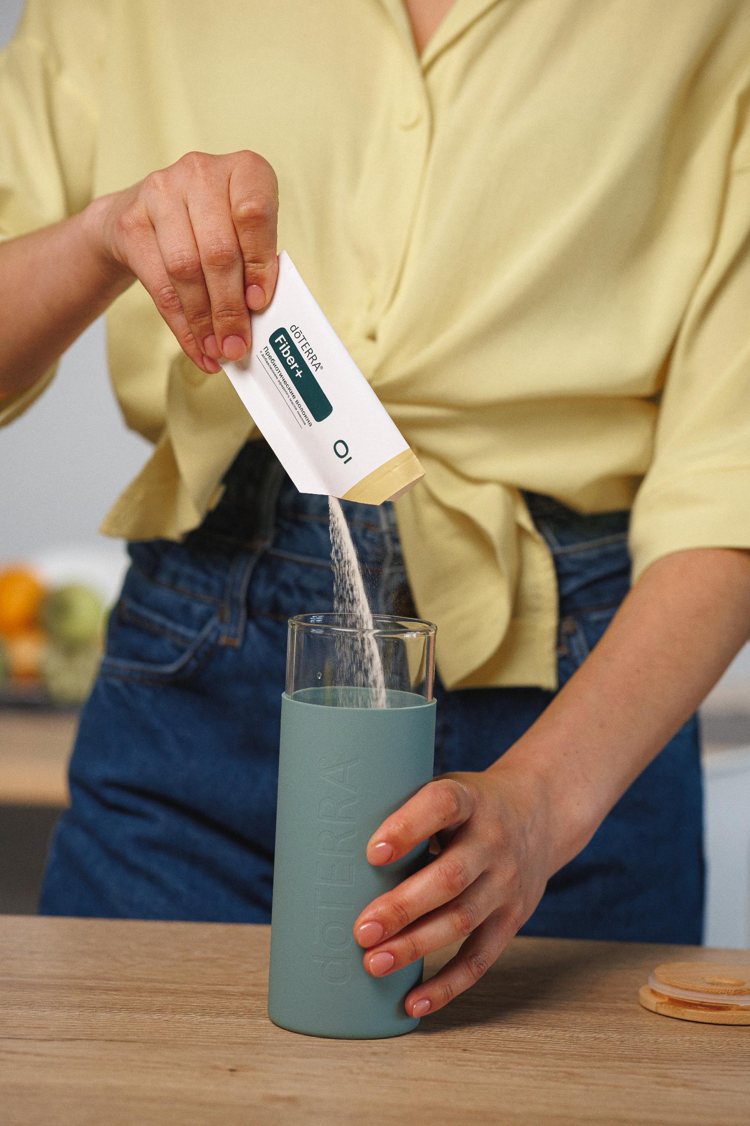 Размешайте одну мерную ложку doTERRA Fiber в 300 мл воды. Выпейте сразу.