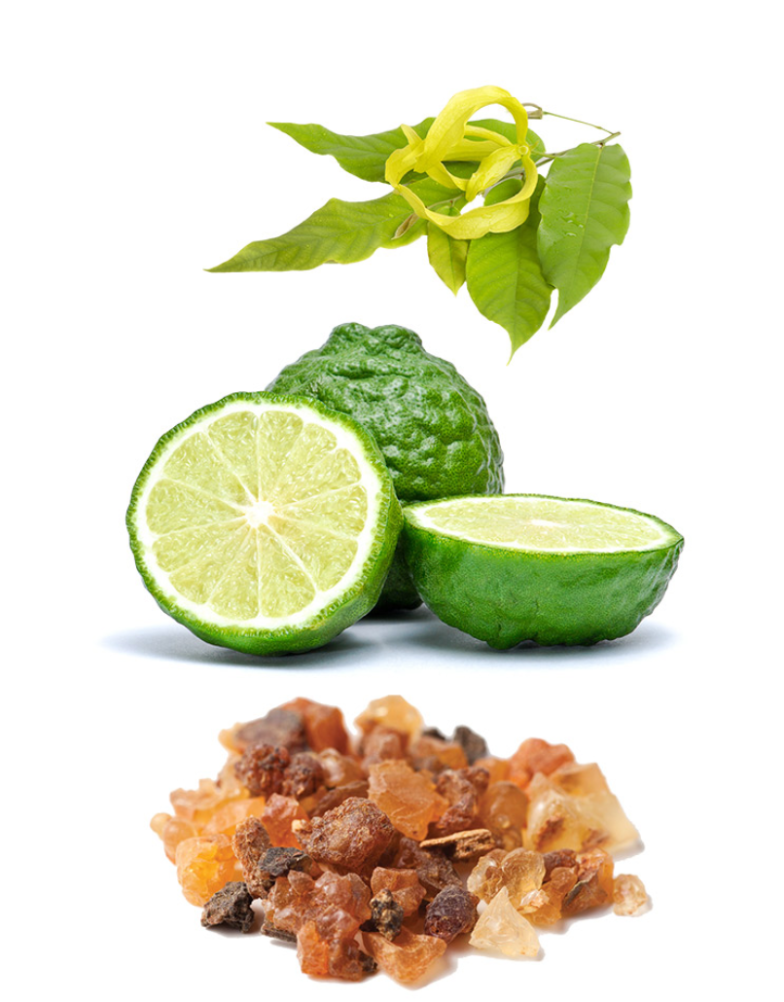 Фракционированное кокосовое масло, плоды бергамота, цветки иланг-иланга, масло ладана, абсолют стручков ванили *Бергамот без фуранокумаринов не провоцирует чувствительность на солнце.