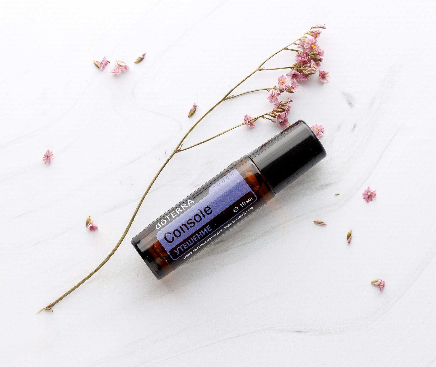 doTERRA Console Touch создает ощущение комфорта и дарит надежду в тяжелые времена. Эта уникальная смесь сочетает в себе сладкий мускусный аромат смеси doTERRA Console с нежным фракционированным кокосовым маслом. Нанесите смесь на область сердца, если чувствуете беспокойство, грусть или тревогу. doTERRA Console Touch поможет вам навсегда избавиться от печали и сделать первые шаги навстречу душевному исцелению.